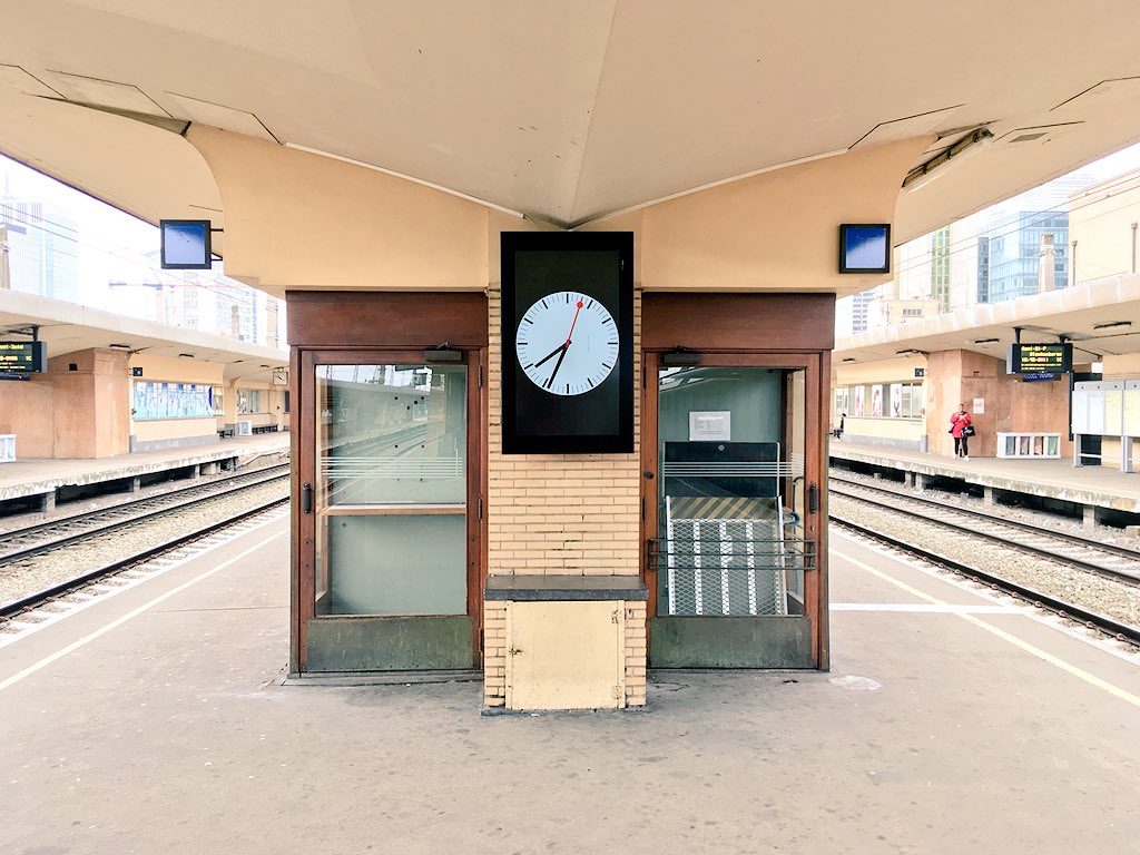 Das ist eine Uhr der belgischen Bahngesellschaft SNCB in Brüssel Nord.